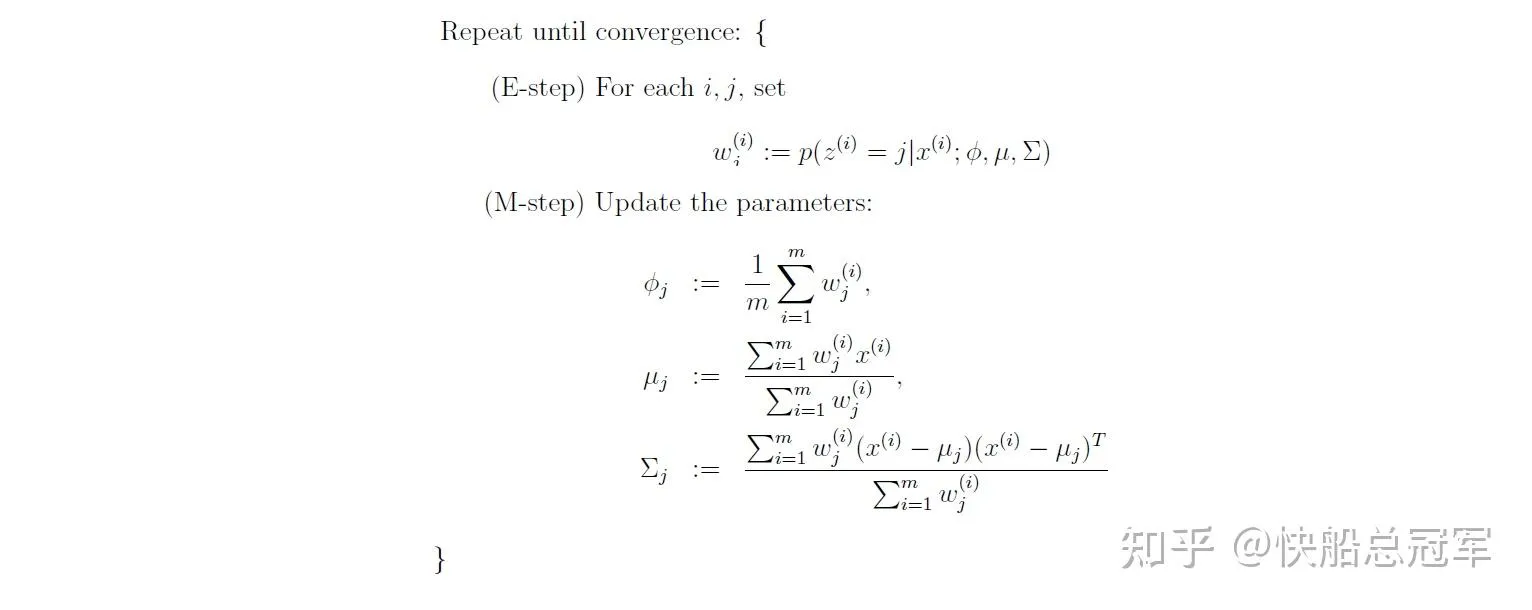 对于每一个循环中我们假设了 P(zi=j∣xi,ϕ)=Σi=1kP(xi∣zi=j,ϕ)P(zi=j,ϕ)P(xi∣zi=j,ϕ)P(zi=j,ϕ) ,并保持它在该循环不变,更新相应的参数,最后该表达式会收敛到确定的参数值。