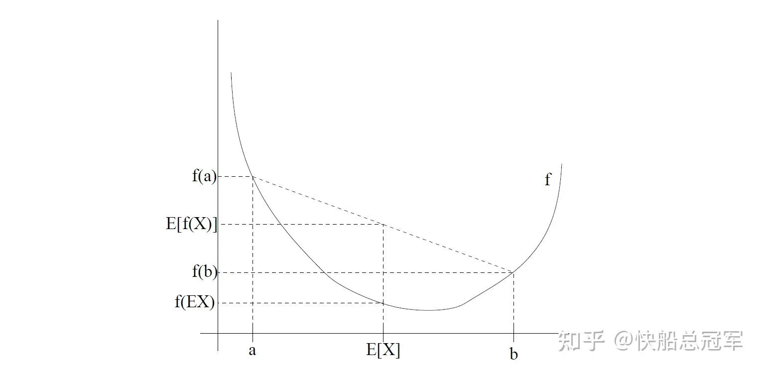 Jenson Inequality:E(f(x))>f(E(x)) 对于任何的凹函数成立,反之符号相反