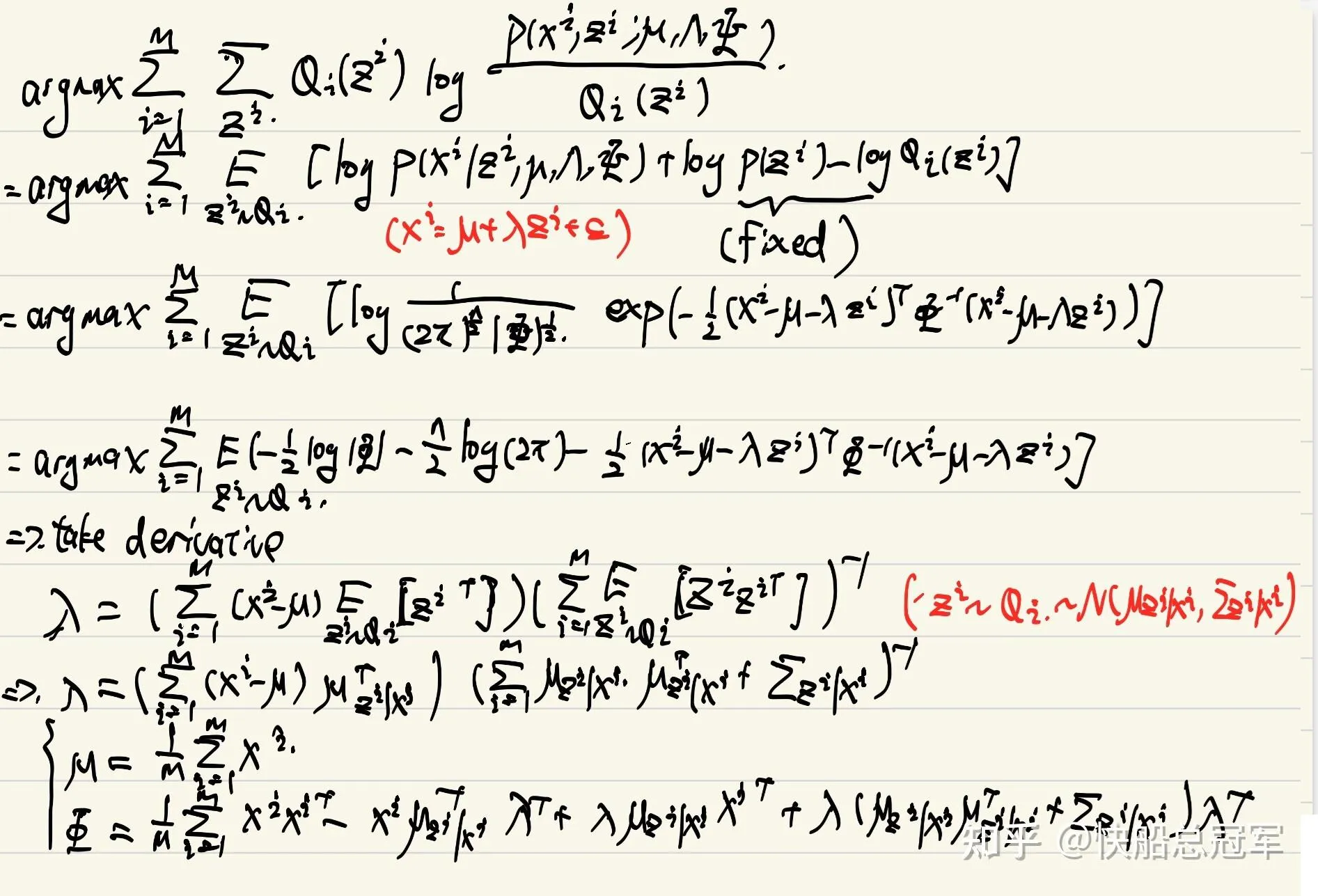 E step: 计算 P(zi∣xi,ϕ) ,由我们的假设,这是z和x的一个条件概率分布,也是正态分布,即有 zi∣xi,μ,λ,Φ ~ N(μzi∣xi,Σzi∣xi) ,我们通过协同概率去计算